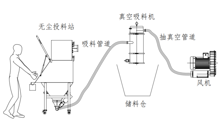 無(wú)塵投料站的工作原理是投料時(shí)產(chǎn)生的物料粉塵被離心風(fēng)機(jī)或抽氣管道形成的負(fù)壓吸到過濾系統(tǒng)中,使物料與空氣分離,防止粉塵四散逃逸、污染周圍環(huán)境和保護(hù)操作者身體健康。